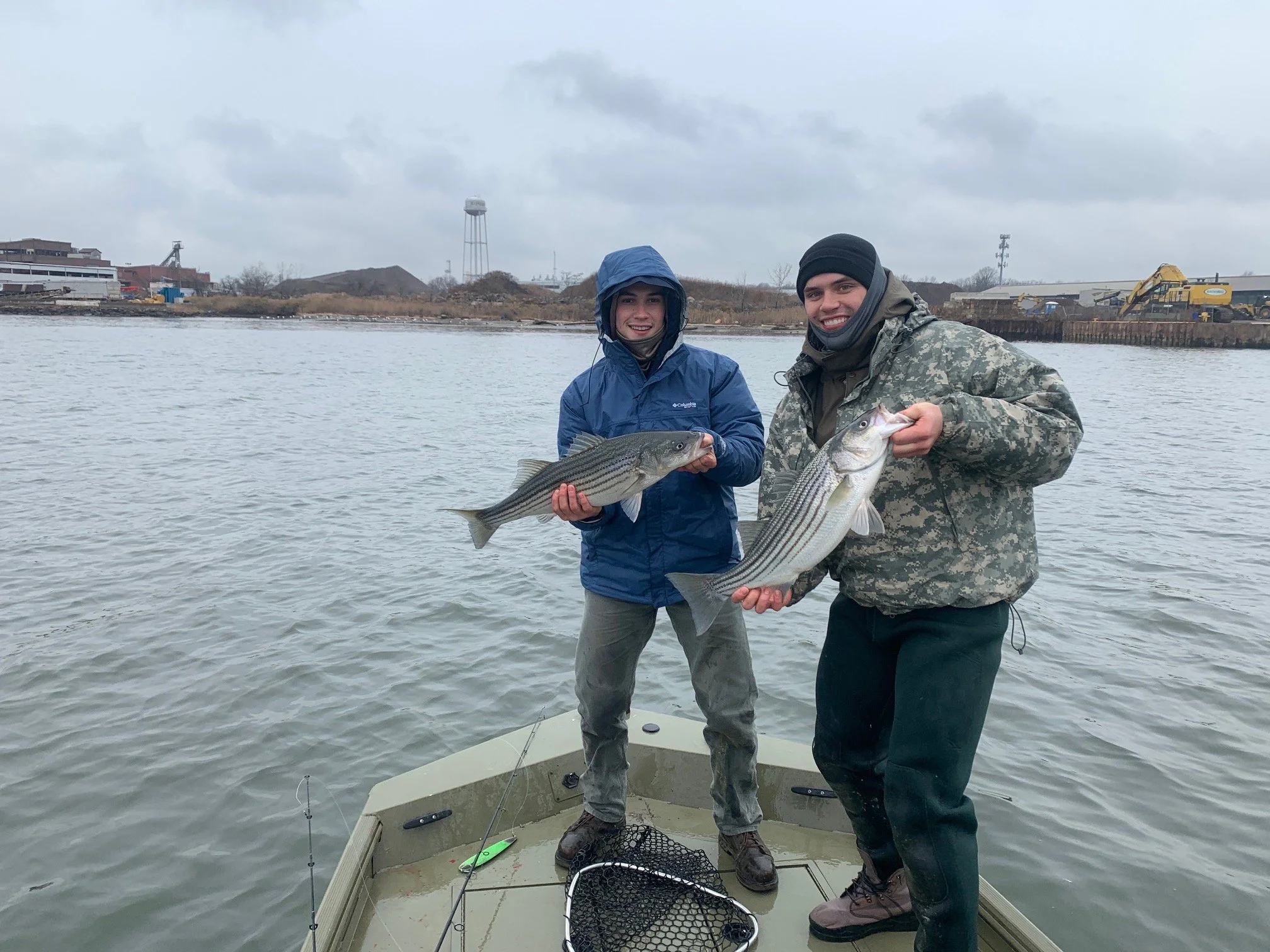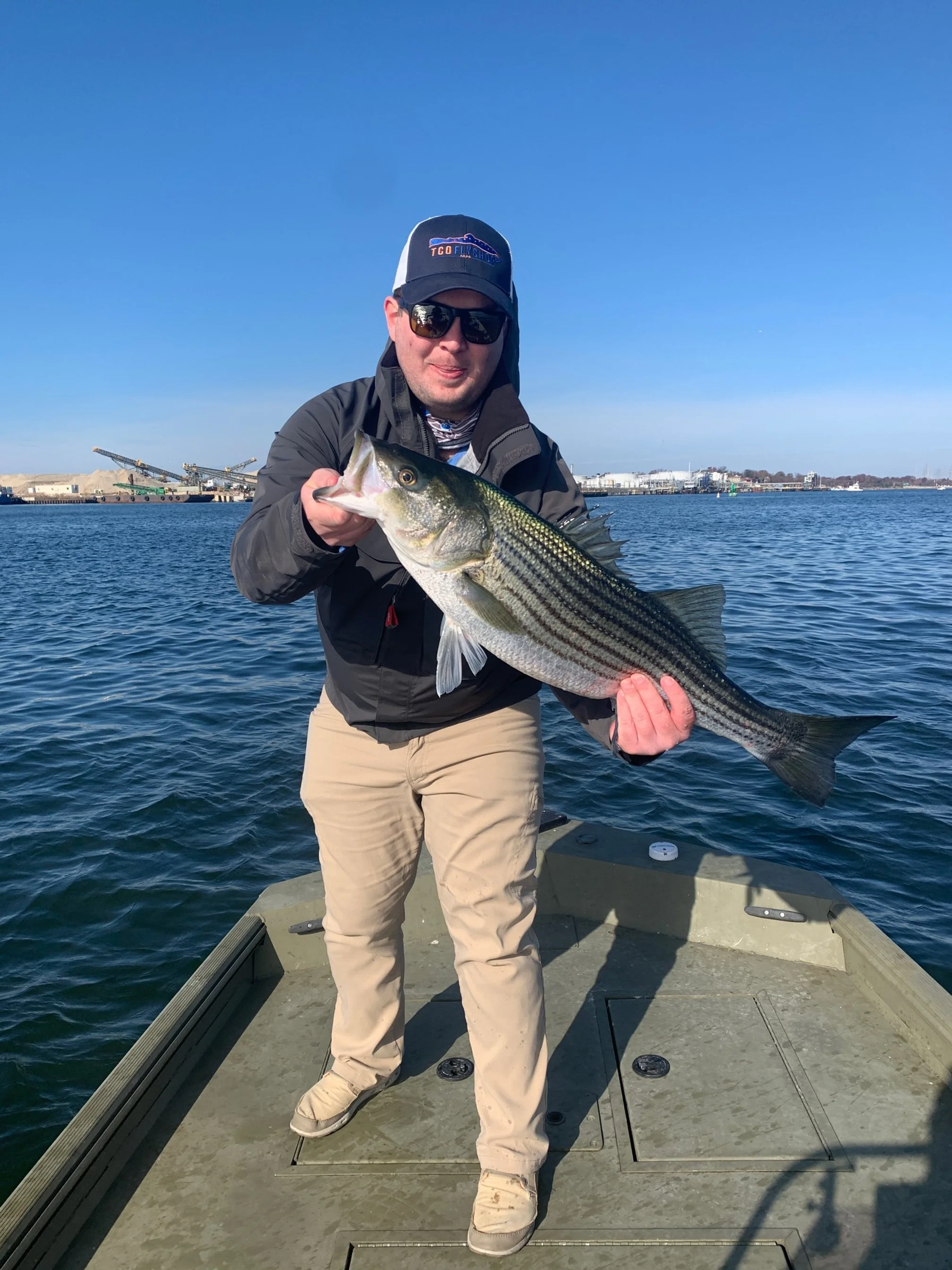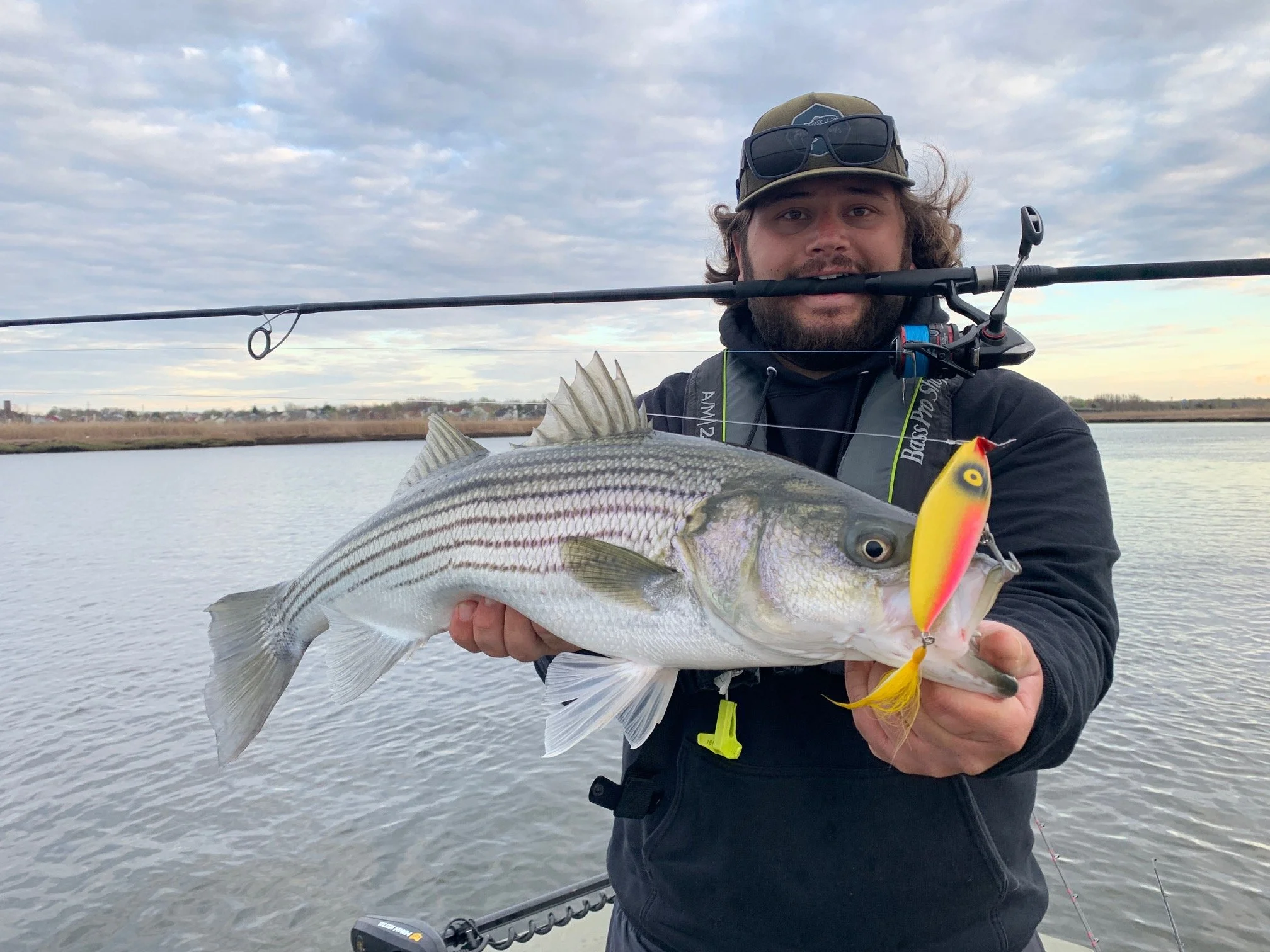 when targeting Striped bass with spinning gear, we tend to fish using light rods with small poppers and jigs to mimic peanut bunker and bay anchovies in the back bays, or heavier equipment utilizing large plugs to mimic adult bunker. We do not utilize bait to target striped bass.